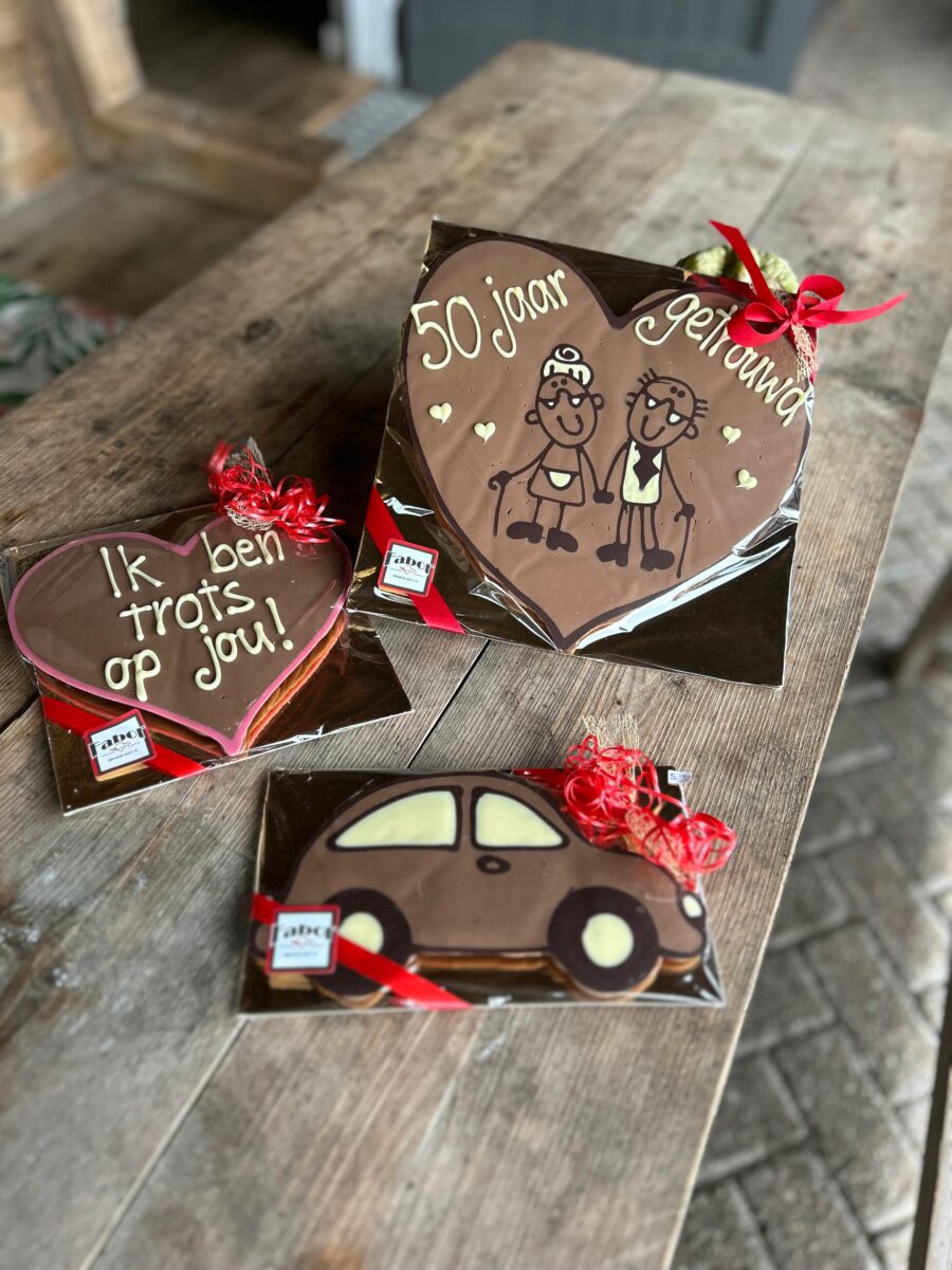 Bovendien is het leuk om een persoonlijk geschreven reep toe te voegen aan een ander chocolade geschenk en zo een uniek cadeau samen te stellen. Of uw reep in een luxe cadeautas, dit maakt het helemaal af.
