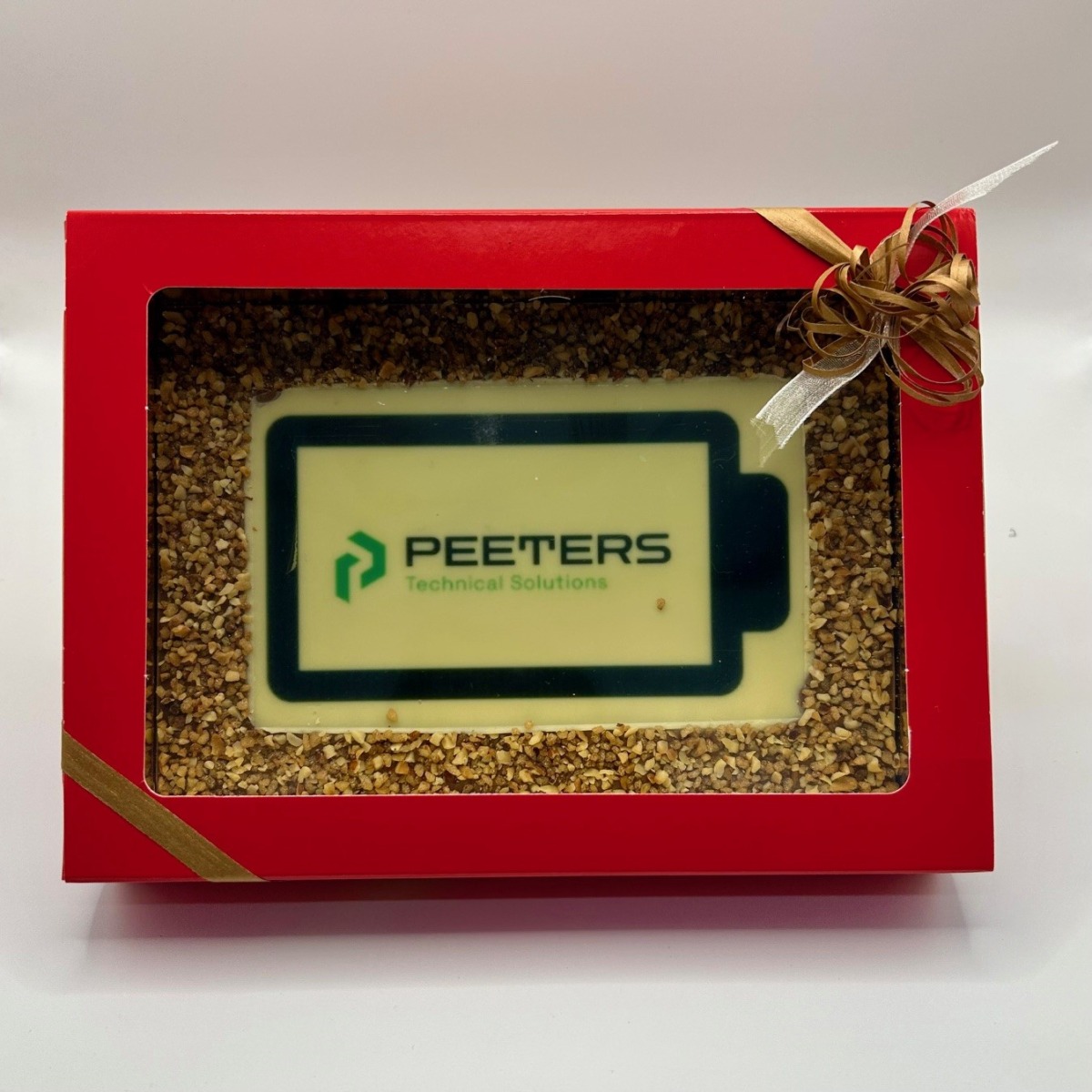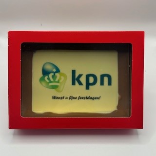 Uniek cadeau met uw logo of foto in een vensterdoos gevuld met chocolade.